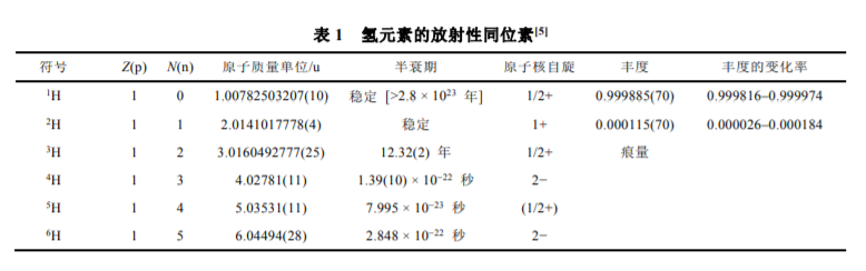 氢的自然同位素一般是 3 种:氢(氕),氘和氚。然而,人工制造的氢同位素也至少有 3 种(表 1), 这些氢的同位素一般是由高能粒子轰击而得到,粒子轰击技术制备放射性同位素是 20 世纪物理学 的重要成就,也是人类认识原子结构的重要的手段,特别是周期表中新发现的重元素几乎都是人工 合成的。